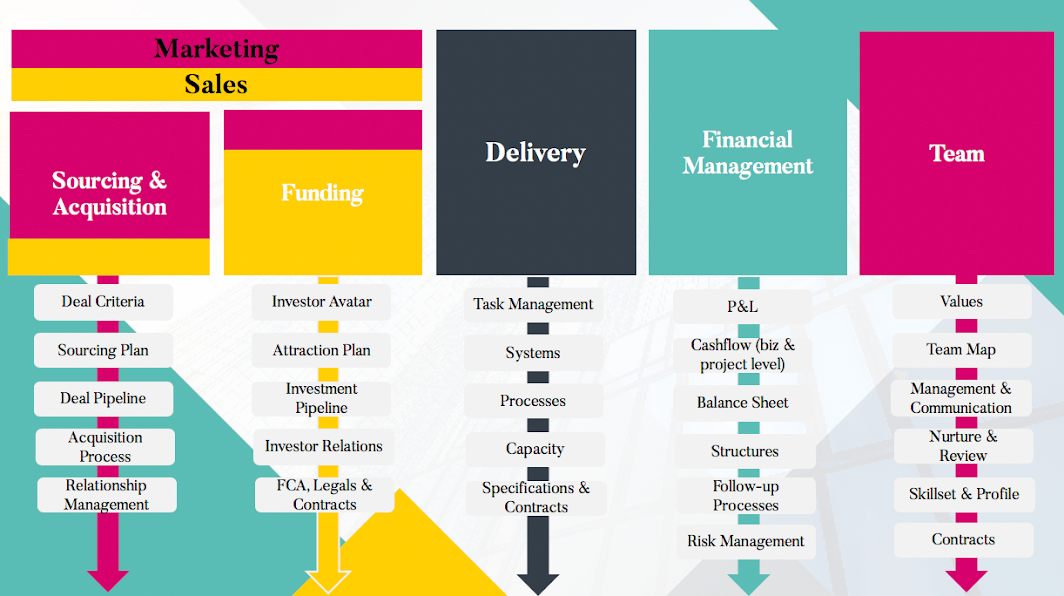 - Funding: consistently attracting the right type of investment to you (in a legal way that complies with FCA regulation) and ensure that you have BOTH the Deals AND the Funding at the same time